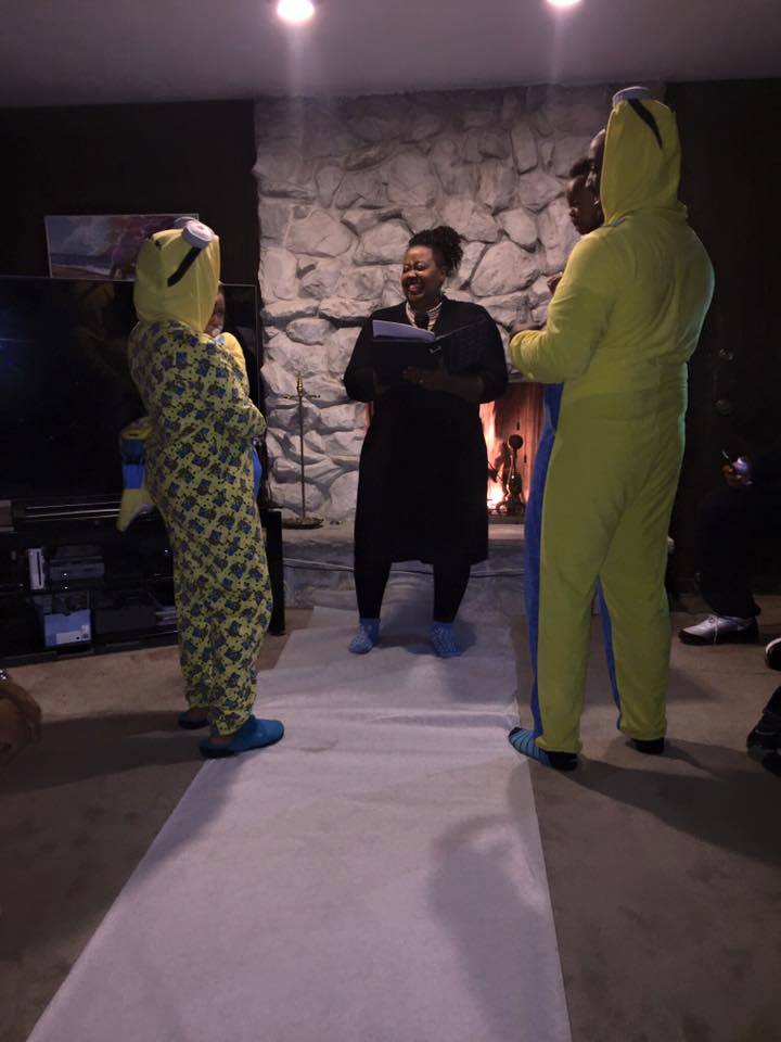 We are young parents to two toddler boys and have been together for more than six years. He popped the question during the baby shower for our first born. I didn’t hesitate to say yes. In a surprise ceremony on Christmas day, we were wed donning Minions pajamas along with our two sons. A host of 30+ friends and family gathered for the uniquely customized, intimate, fireside wedding celebration. Coach Niquenya of Chicago Love Connection officiated the ceremony and did a great job.